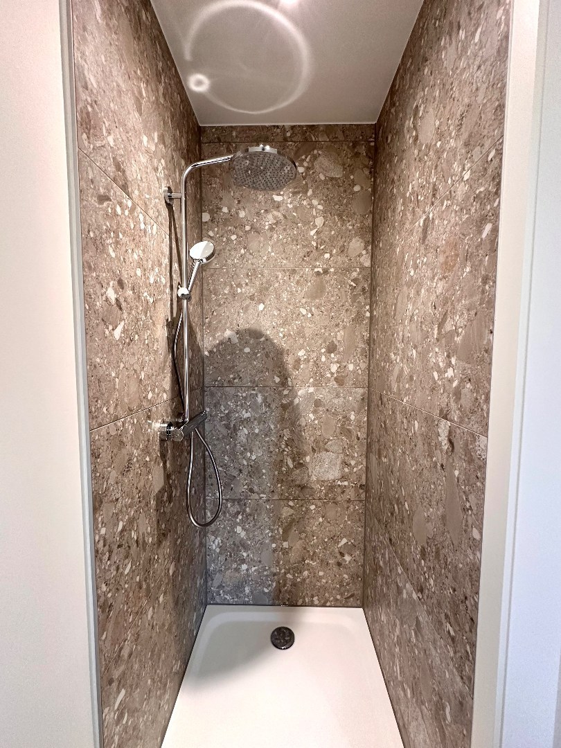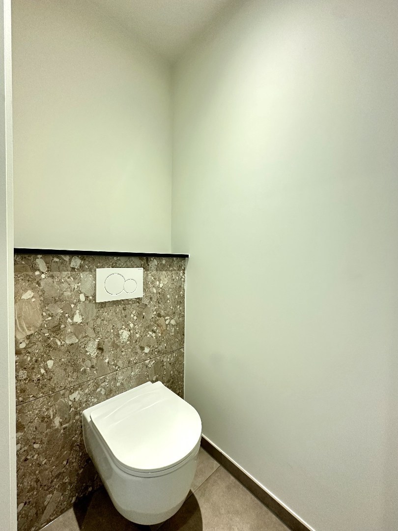 Daarnaast zijn er twee badkamers — één met dubbele lavabo en douche, en één met lavabo en douche — plus een apart toilet.