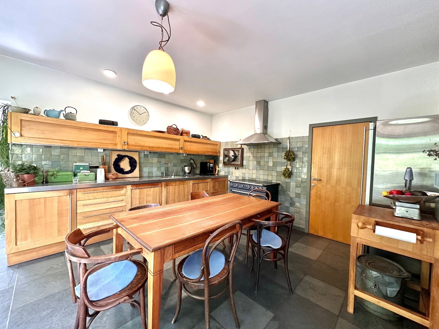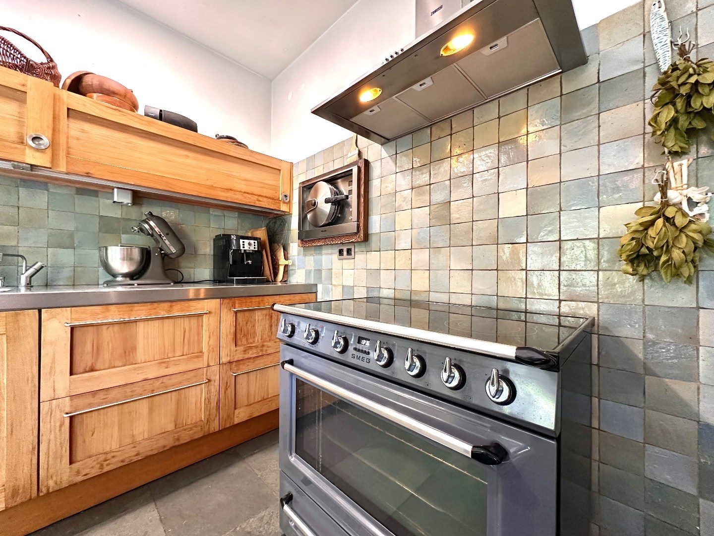 De keuken is een echte eyecatcher en uitgerust met hoogwaardige toestellen en materialen, waaronder een ingebouwde stoomoven van Miele, een stijlvolle vrijstaande inductiekookplaat met oven van Smeg en een moderne Quooker kraan. Aansluitend bevindt zich een handige achterkeuken/berging.