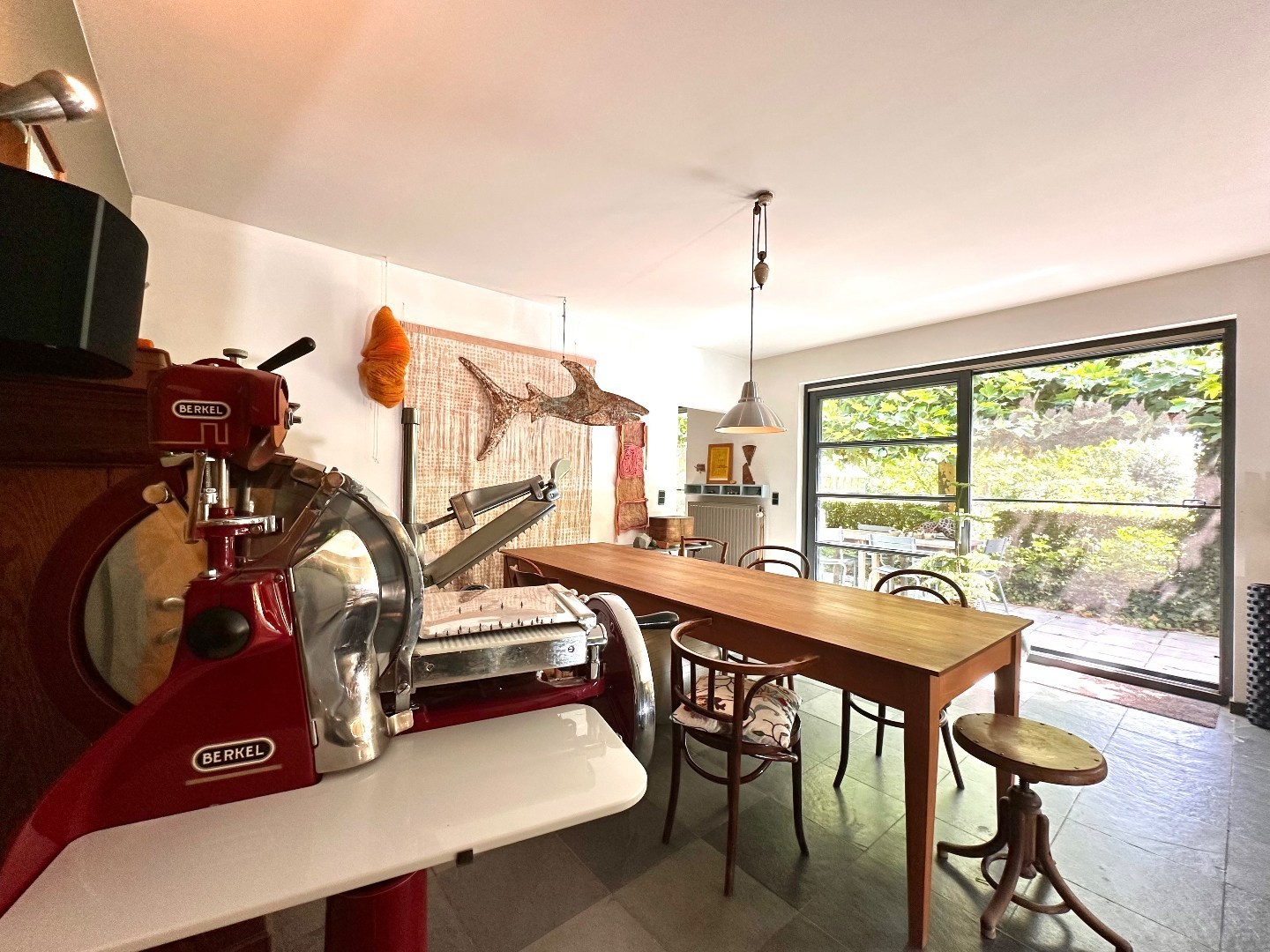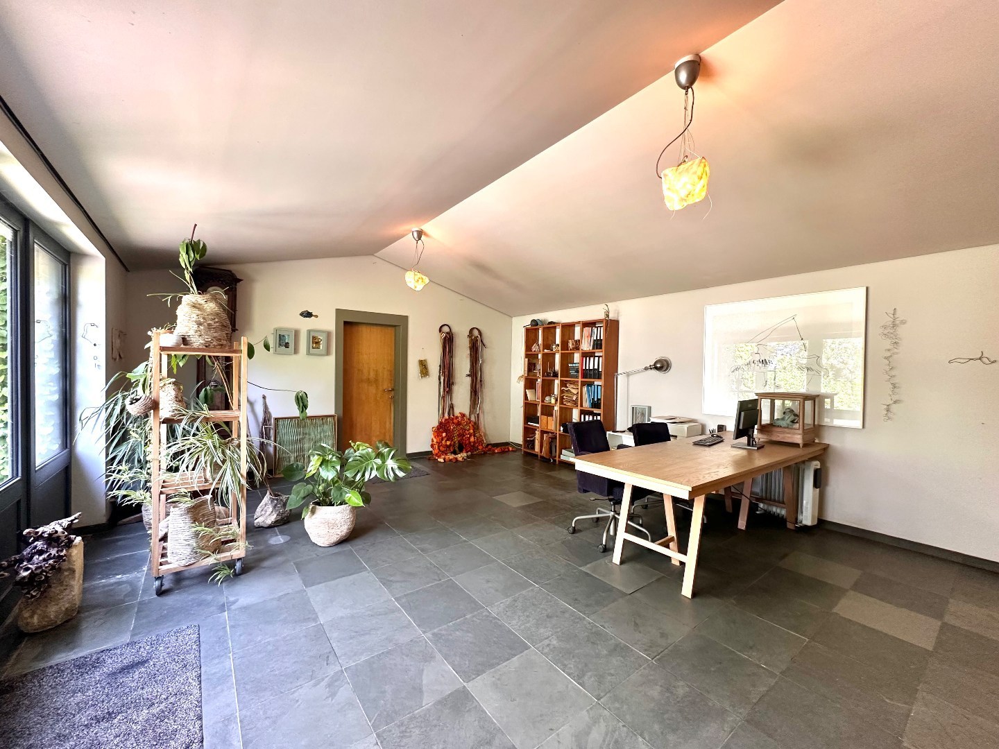Vanuit de keuken bereik je het commerciële gedeelte, met een ruim en functioneel kantoor. Dit kantoor leidt op zijn beurt naar de professionele werkplaats van 375 m², momenteel ingericht voor schrijnwerkerij, maar geschikt voor tal van doeleinden.