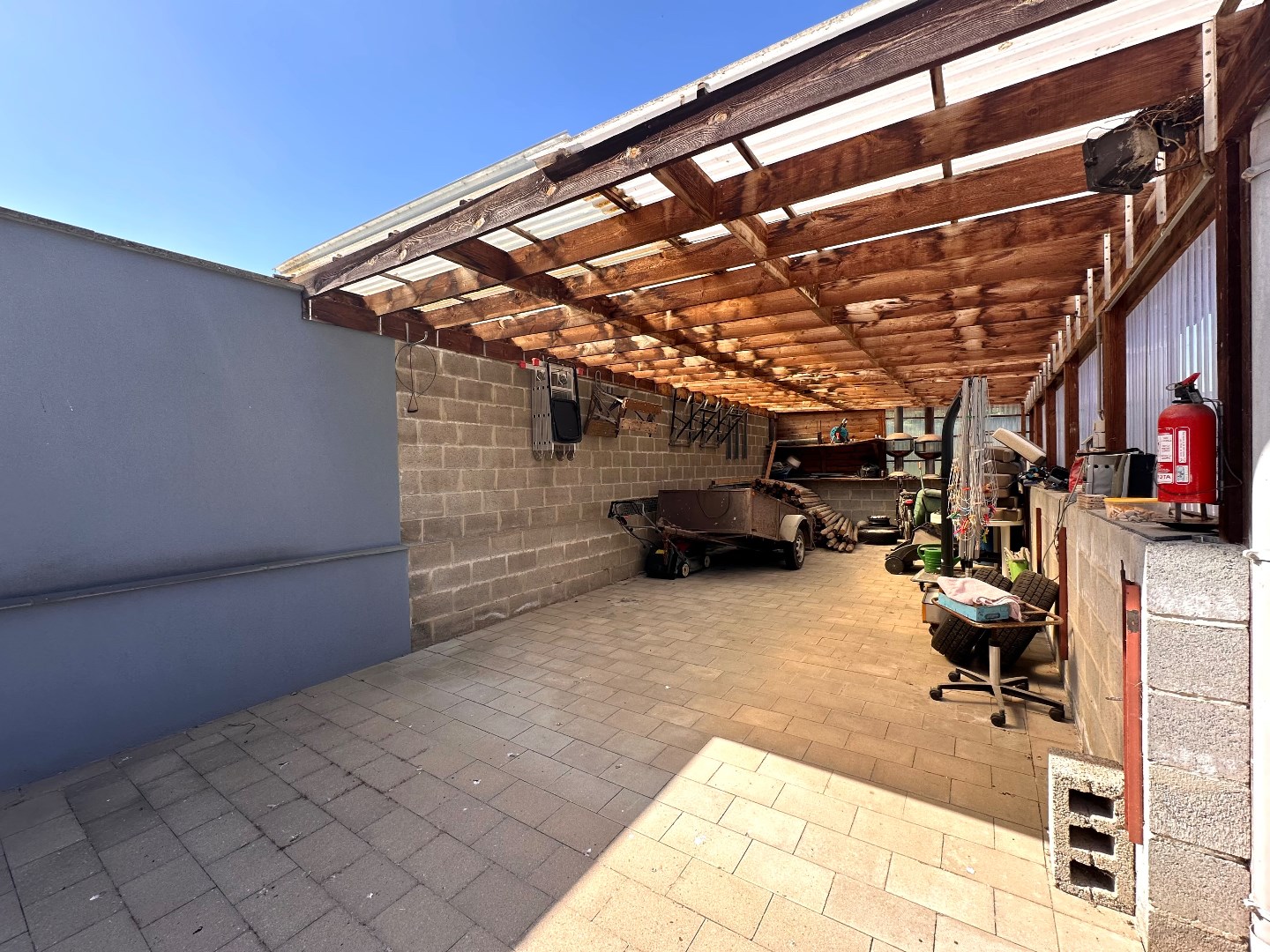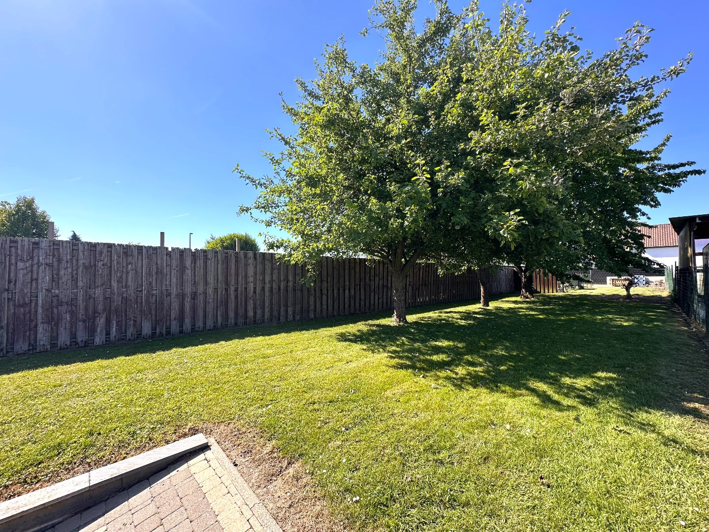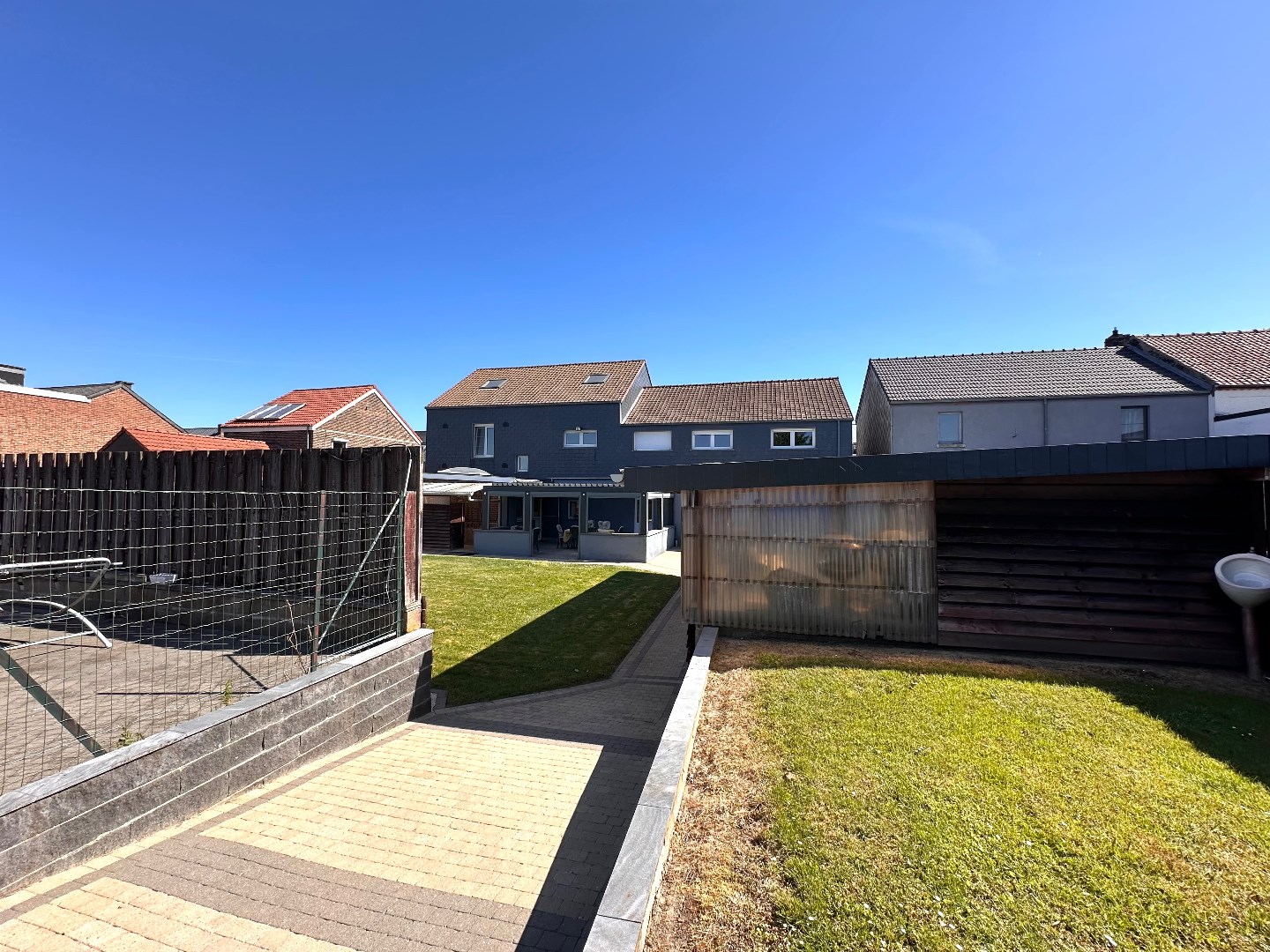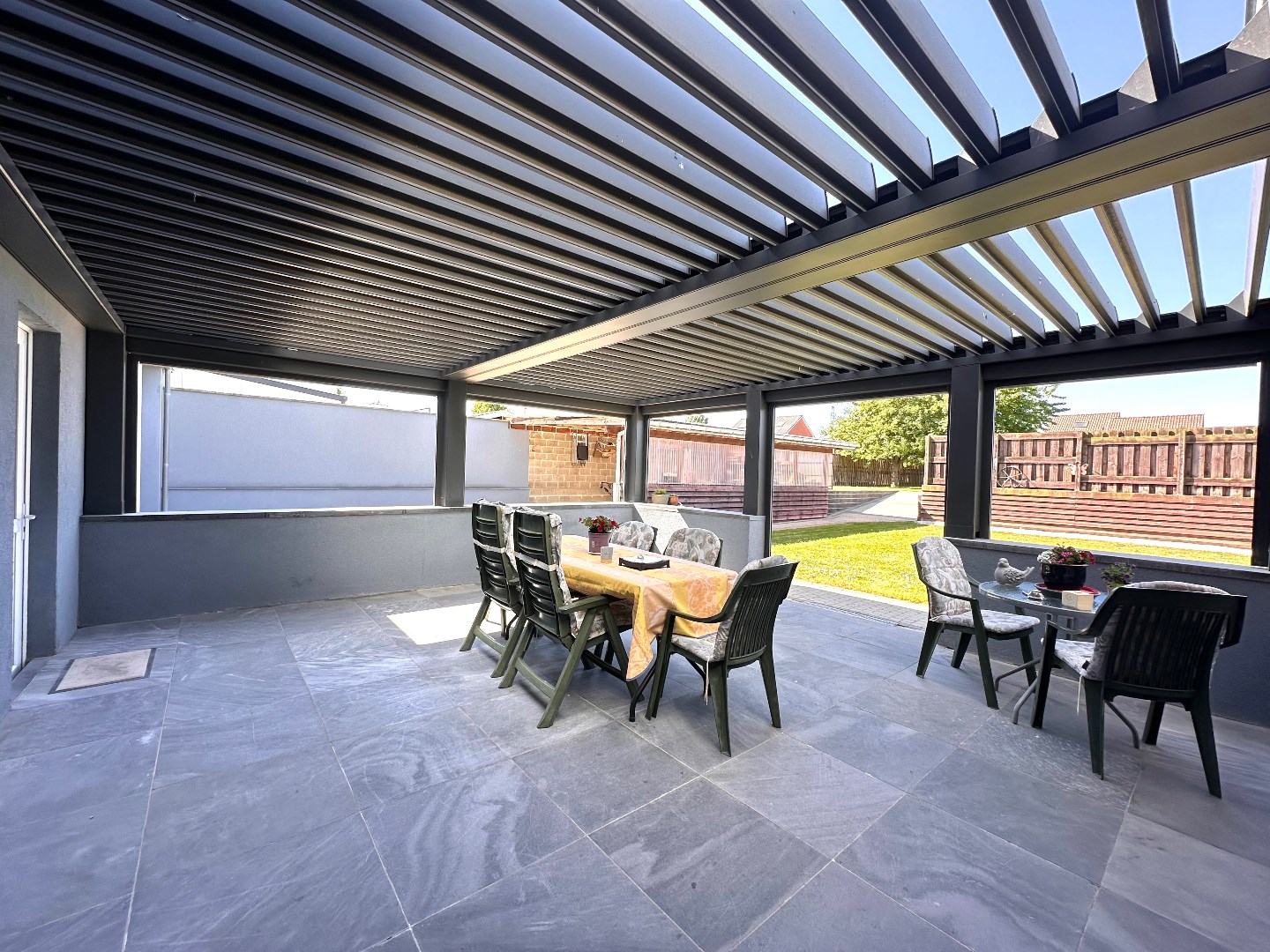 De tuin is zuidwestelijk georiënteerd en strekt zich diep uit over het perceel, wat zorgt voor optimale lichtinval gedurende de hele dag. De ruime, dubbele garage (89 m2) is uitgerust met twee sectionale poorten aan de straatzijde en één aan de achterzijde, wat een doorgang naar de tuin mogelijk maakt. Achteraan bevindt zich bovendien een extra grote carport – ideaal voor wie meerdere voertuigen bezit of extra opslagruimte wenst. Op het terras geniet u van de zon, maar met één druk op de knop zorgt de automatische overkapping voor volledige beschutting wanneer gewenst.