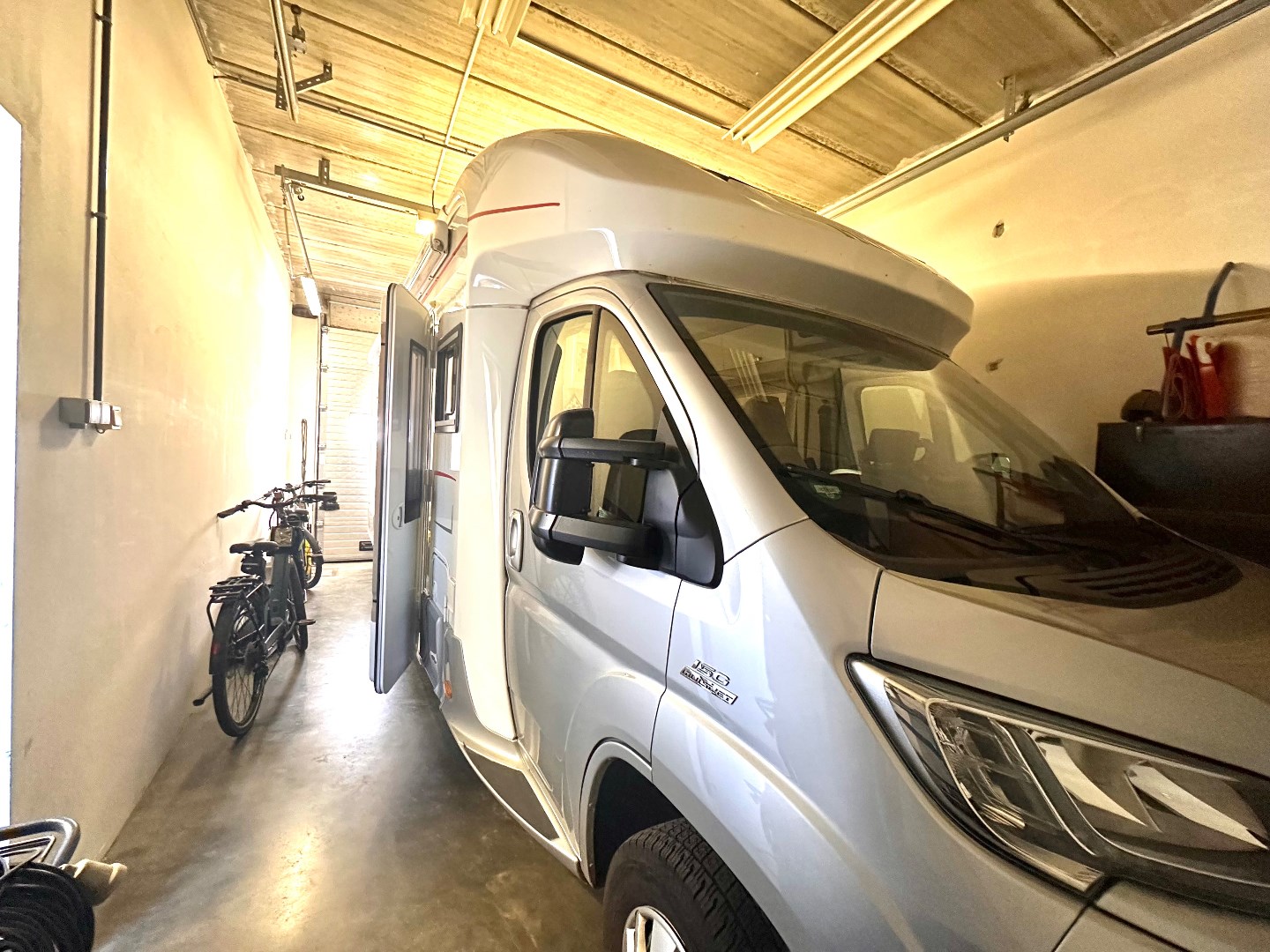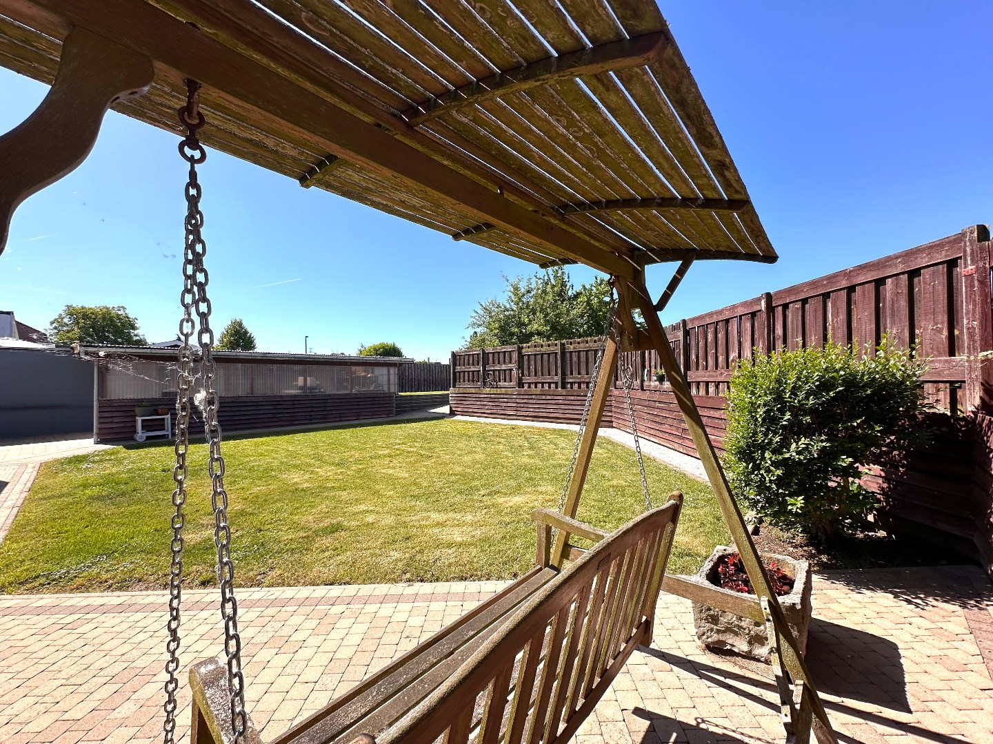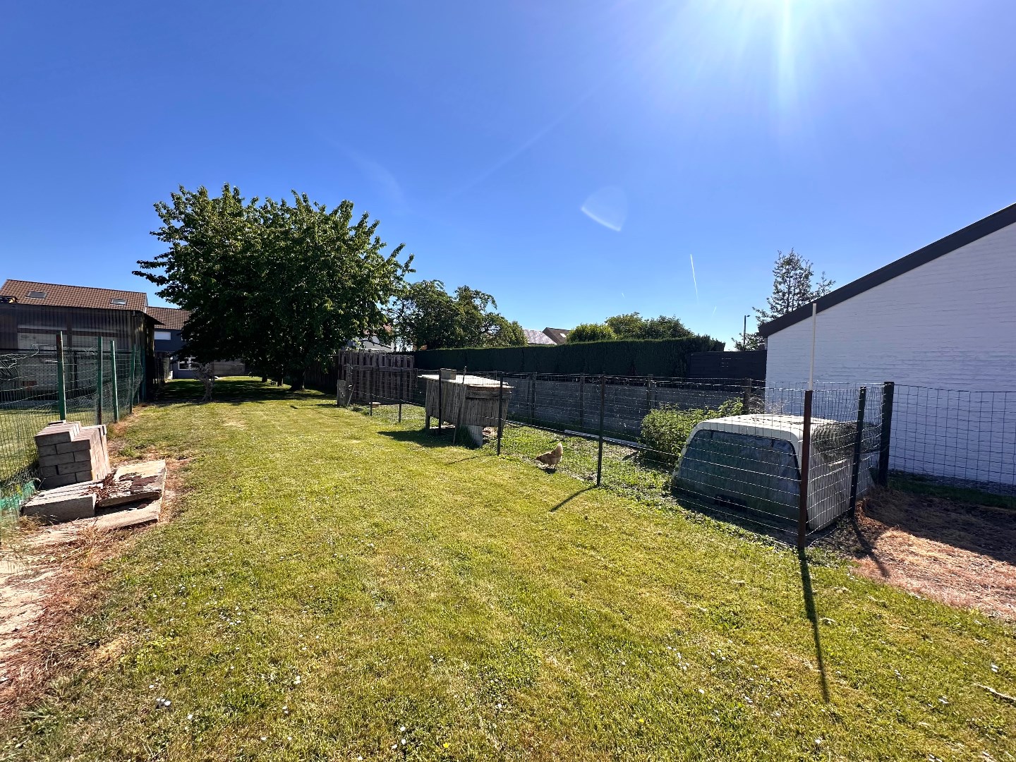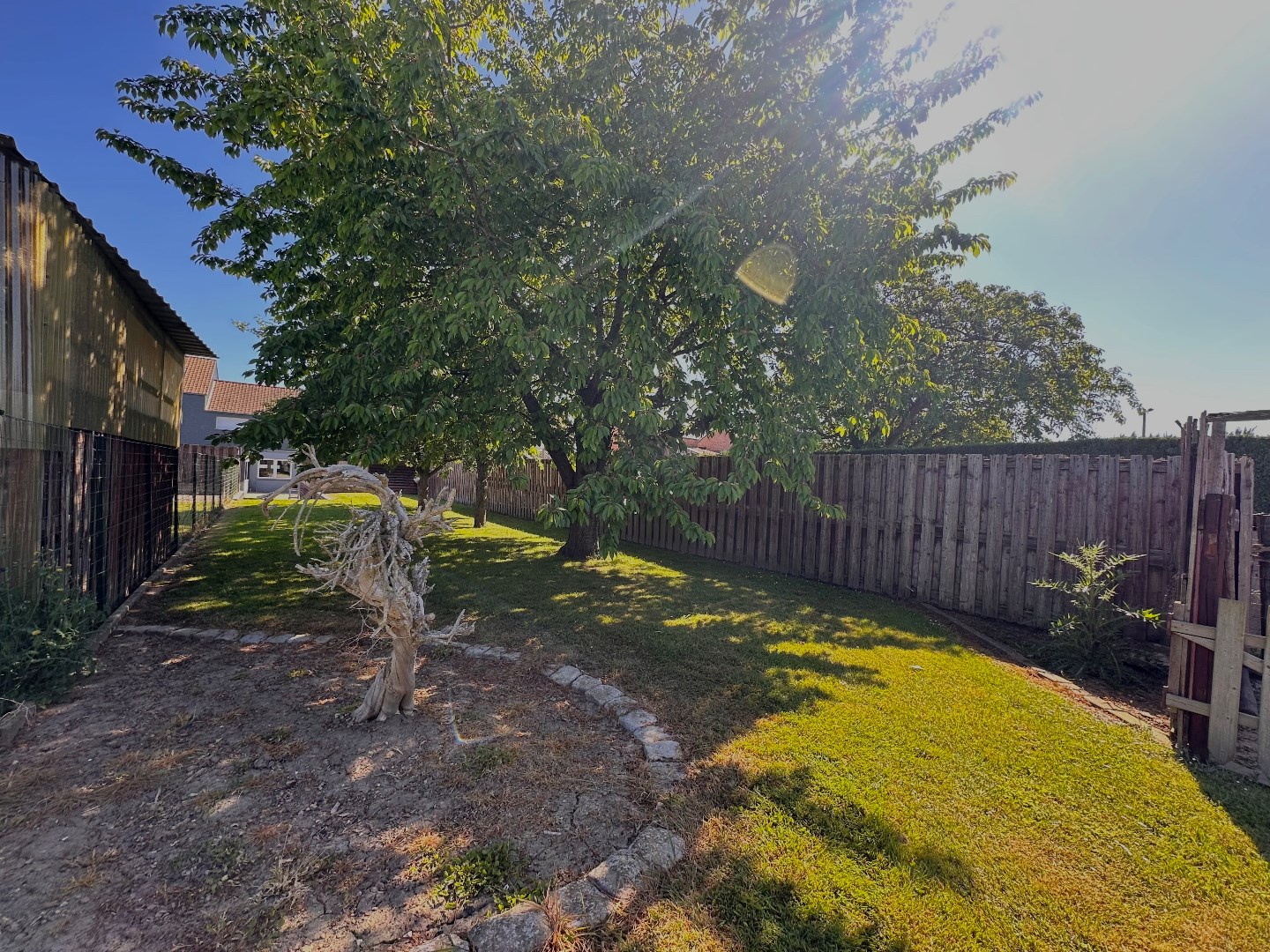 De tuin is zuidwestelijk georiënteerd en strekt zich diep uit over het perceel, wat zorgt voor optimale lichtinval gedurende de hele dag. De ruime, dubbele garage (89 m2) is uitgerust met twee sectionale poorten aan de straatzijde en één aan de achterzijde, wat een doorgang naar de tuin mogelijk maakt. Achteraan bevindt zich bovendien een extra grote carport – ideaal voor wie meerdere voertuigen bezit of extra opslagruimte wenst. Op het terras geniet u van de zon, maar met één druk op de knop zorgt de automatische overkapping voor volledige beschutting wanneer gewenst.