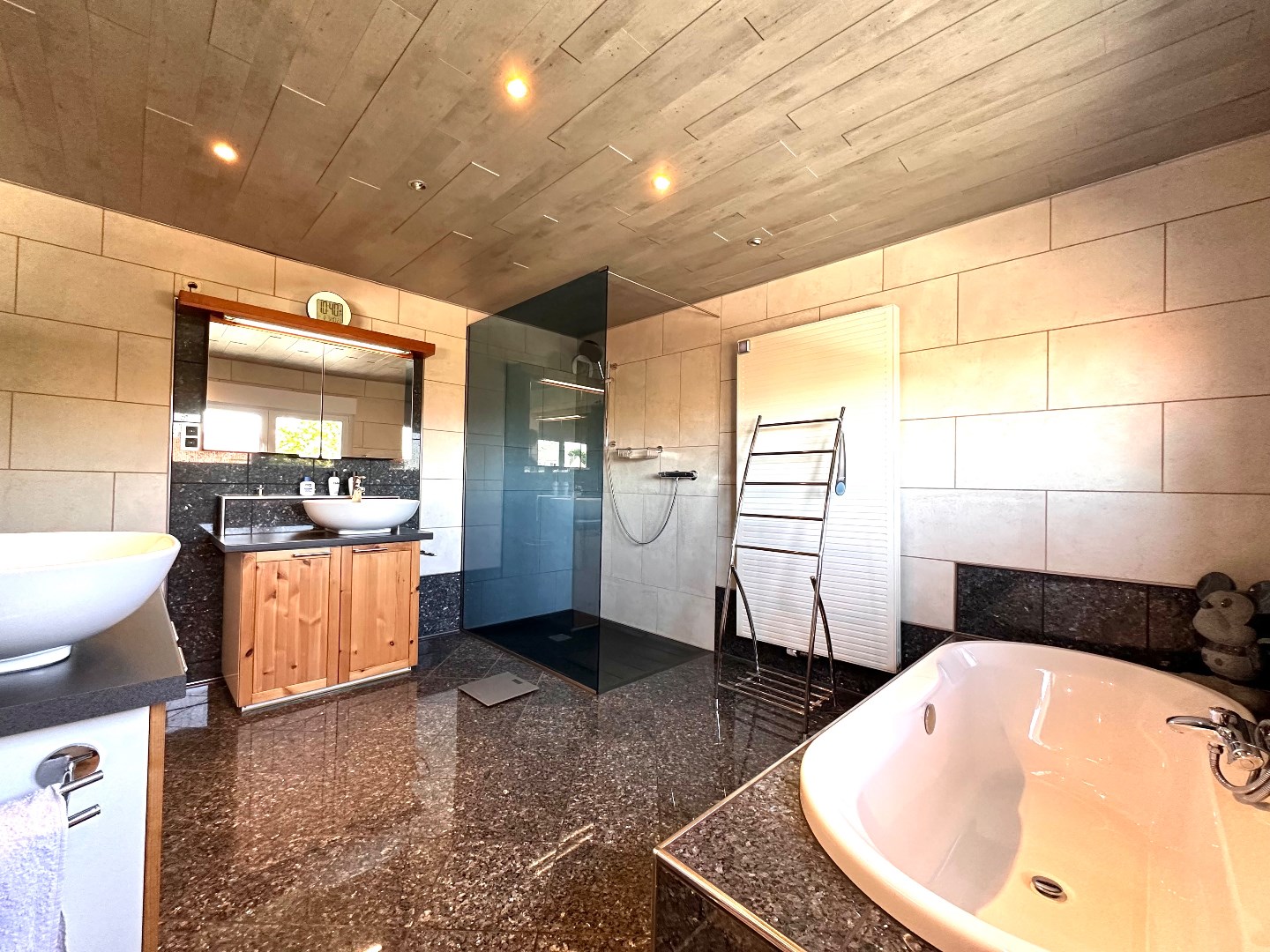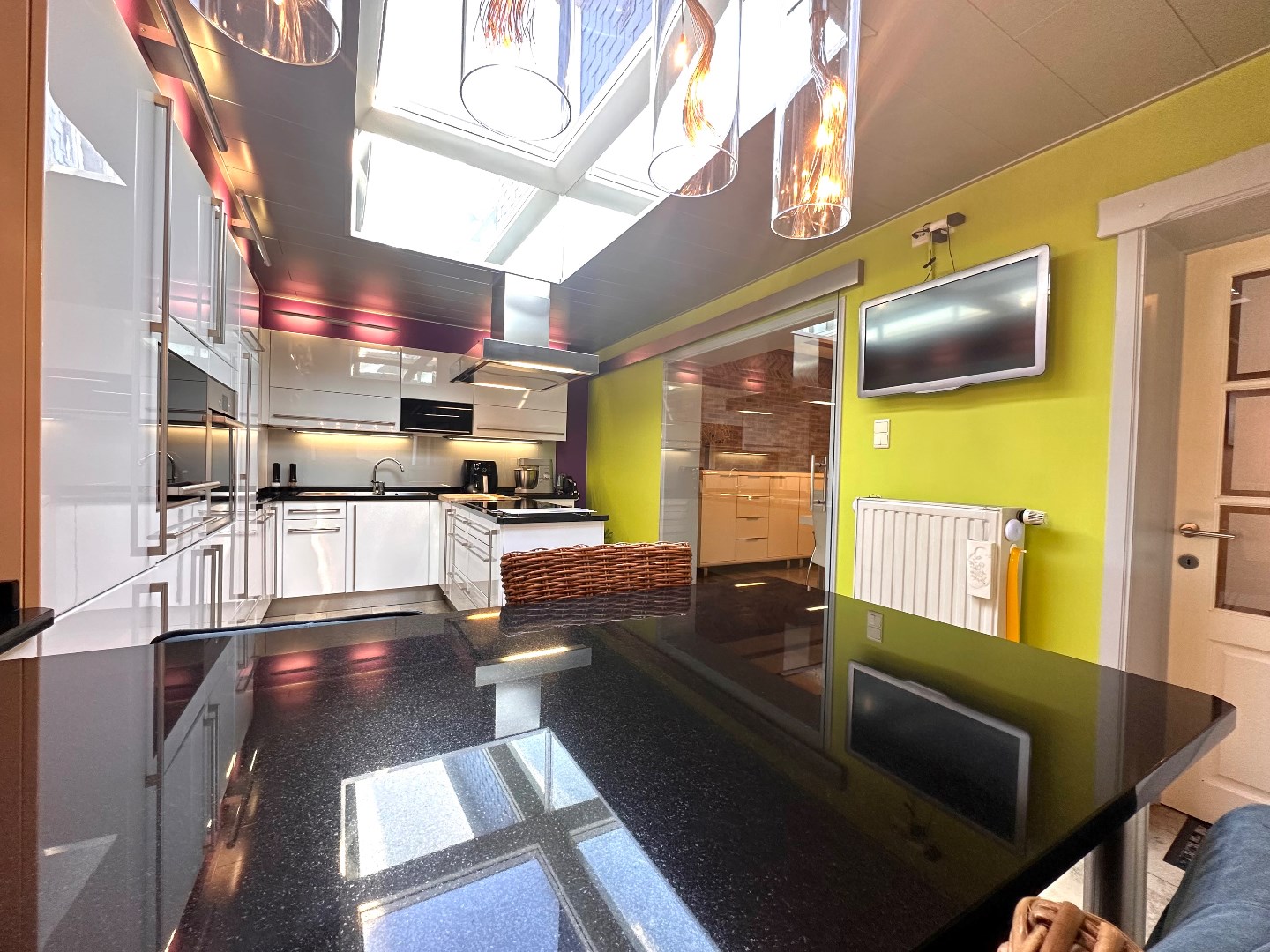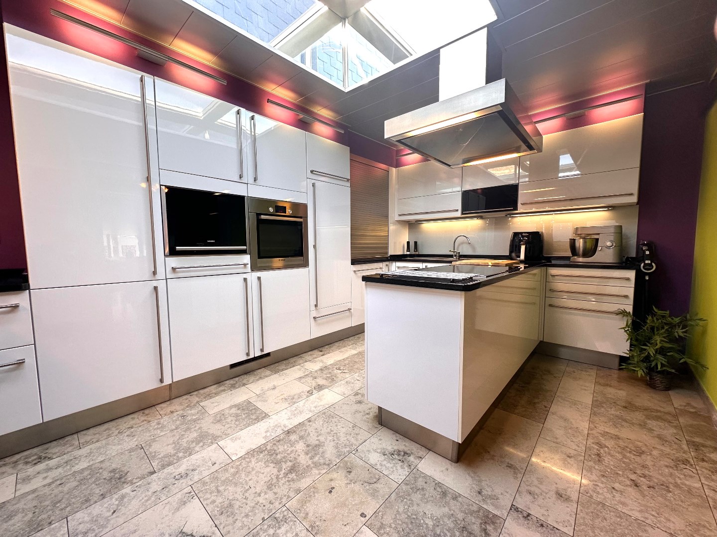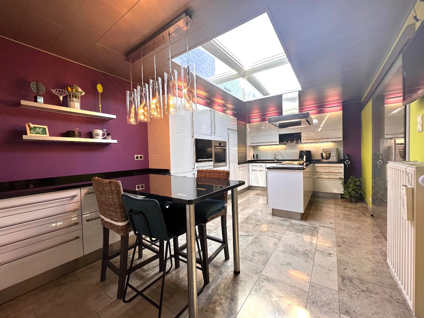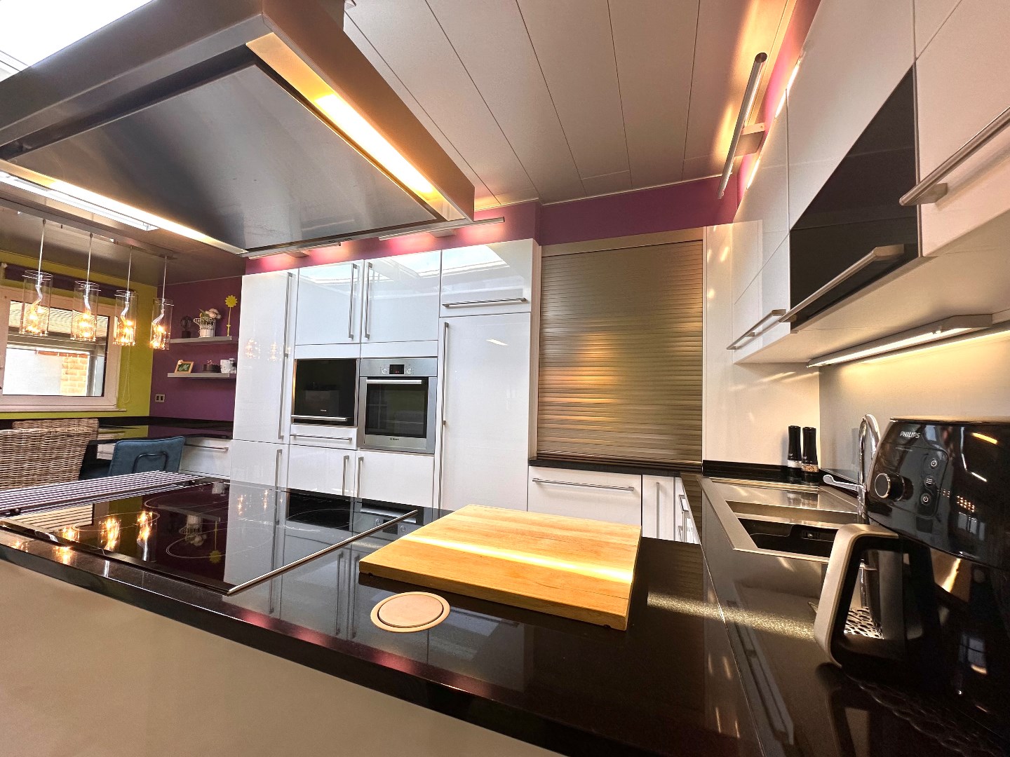 Aangrenzend vindt u de moderne, volledig uitgeruste keuken. Dankzij de efficiënte indeling is er voldoende werk- en bergruimte. De keuken is uitgerust met kwaliteitsvolle toestellen, waaronder een oven, combi-oven, inductiekookplaat, vaatwasser, afzuigkap, twee koelkasten en een diepvriezer. Vanuit de keuken heeft u directe toegang tot het overdekte terras, dat voorzien is van een lamellendak en screens – ideaal om ook bij minder gunstig weer van het buitenleven te genieten.