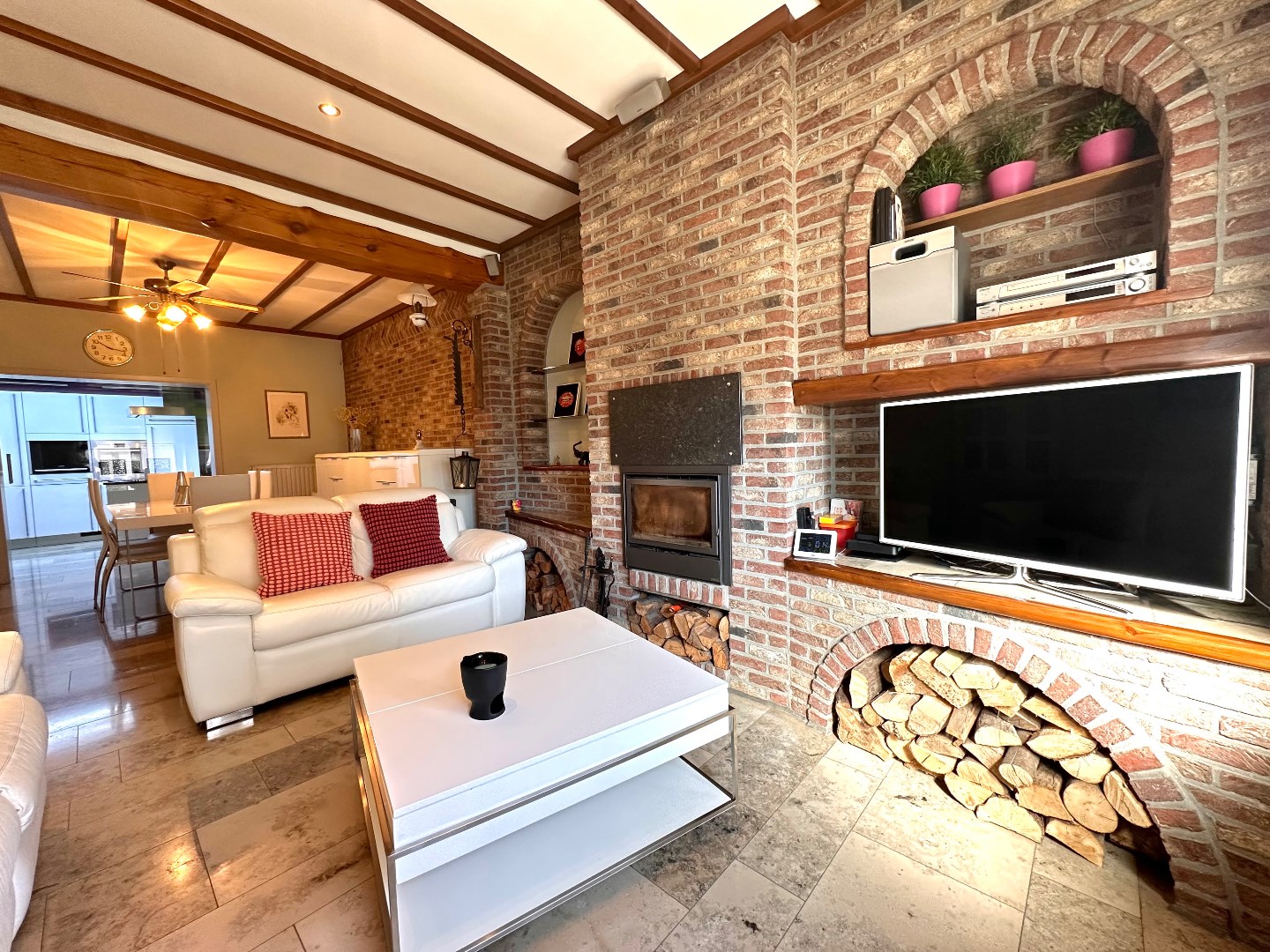 De gezellige leefruimte van circa 32 m2 vormt het hart van de woning. Hier zorgt een stijlvolle houtkachel voor extra sfeer en comfort – perfect voor ontspanning of om gasten te ontvangen.