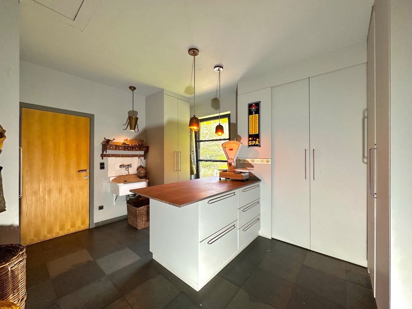 De keuken is een echte eyecatcher en uitgerust met hoogwaardige toestellen en materialen, waaronder een ingebouwde stoomoven van Miele, een stijlvolle vrijstaande inductiekookplaat met oven van Smeg en een moderne Quooker kraan. Aansluitend bevindt zich een handige achterkeuken/berging.