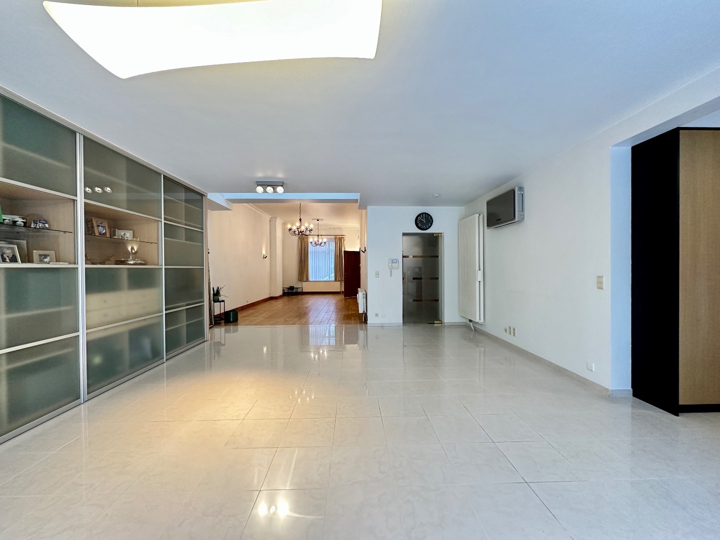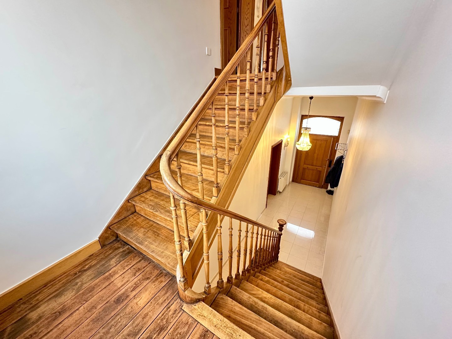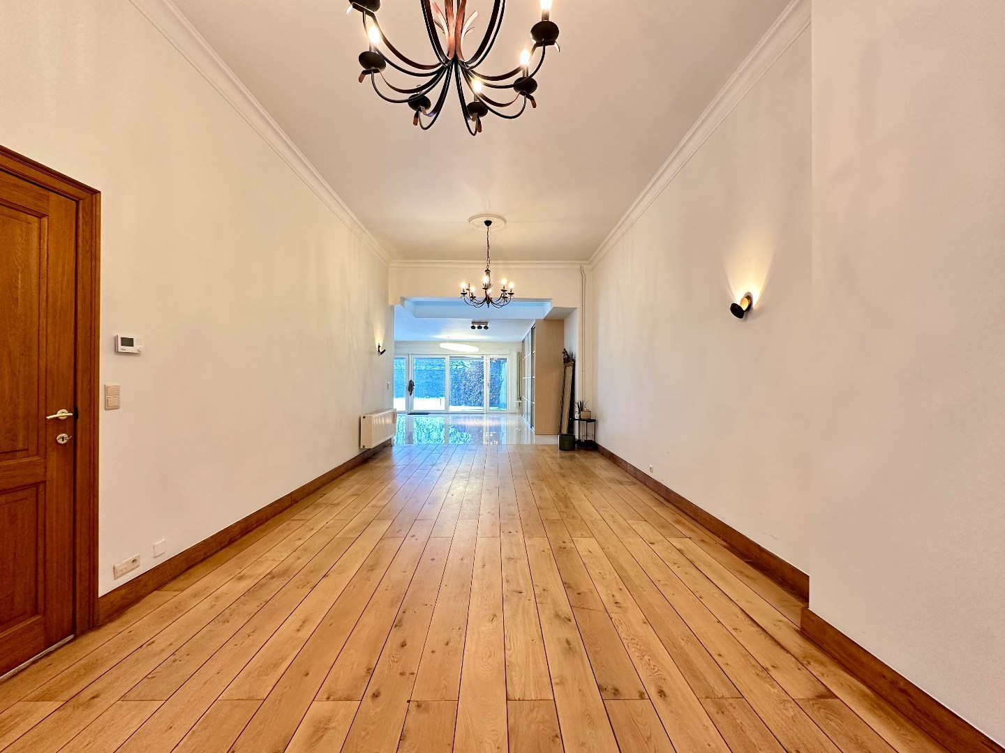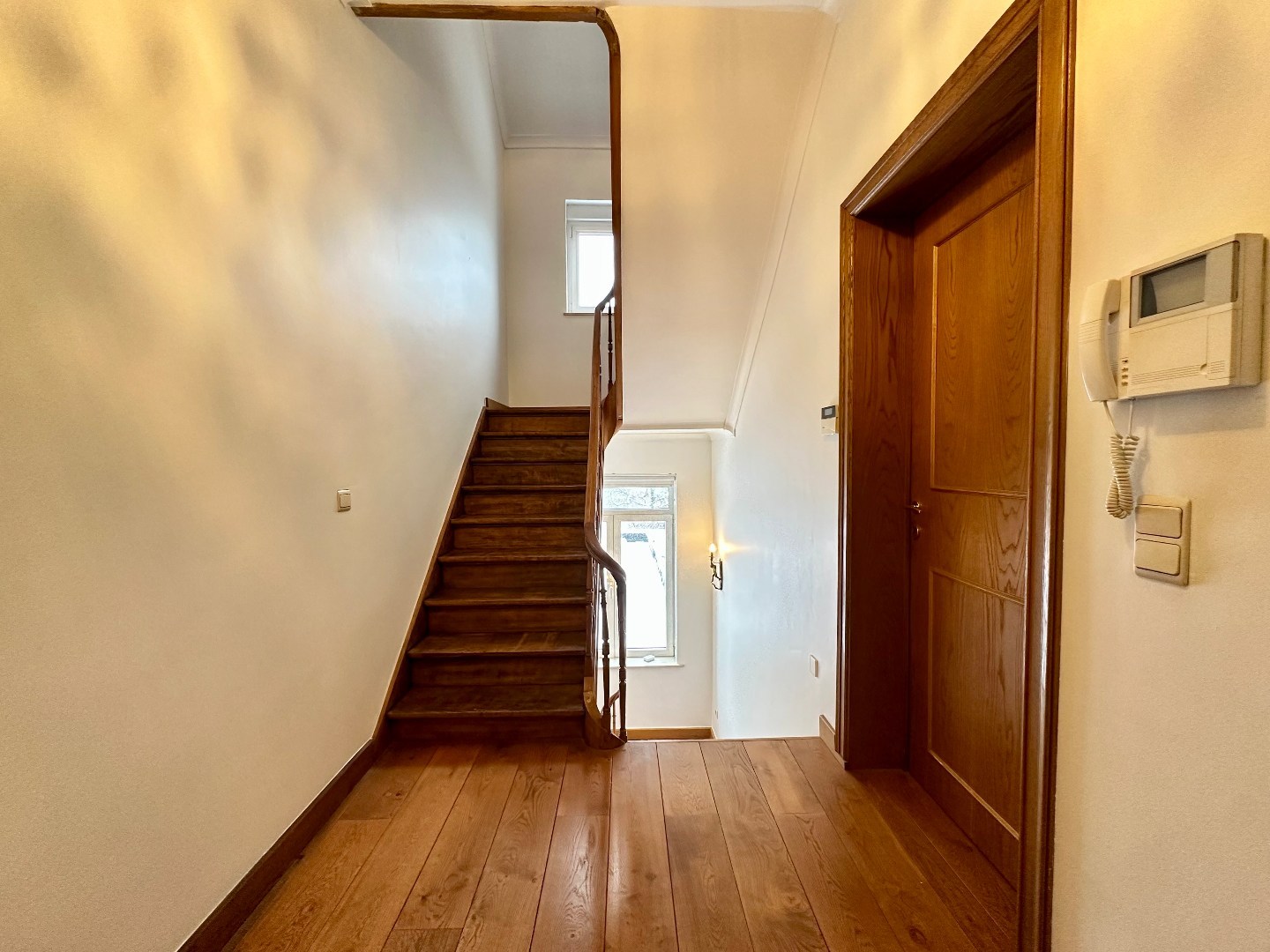 U betreedt de woning via een royale inkomhal met zicht op de indrukwekkende trap, die meteen de klasse van de woning weerspiegelt. Vanuit de hal bereikt u de ruime leefruimte met eiken parket, aansluitend een eetplaats en de moderne, volledig uitgeruste keuken (oven, microgolfoven, koelkast, vaatwasser, …). Dankzij de grote raampartijen geniet u hier van een overvloed aan licht.